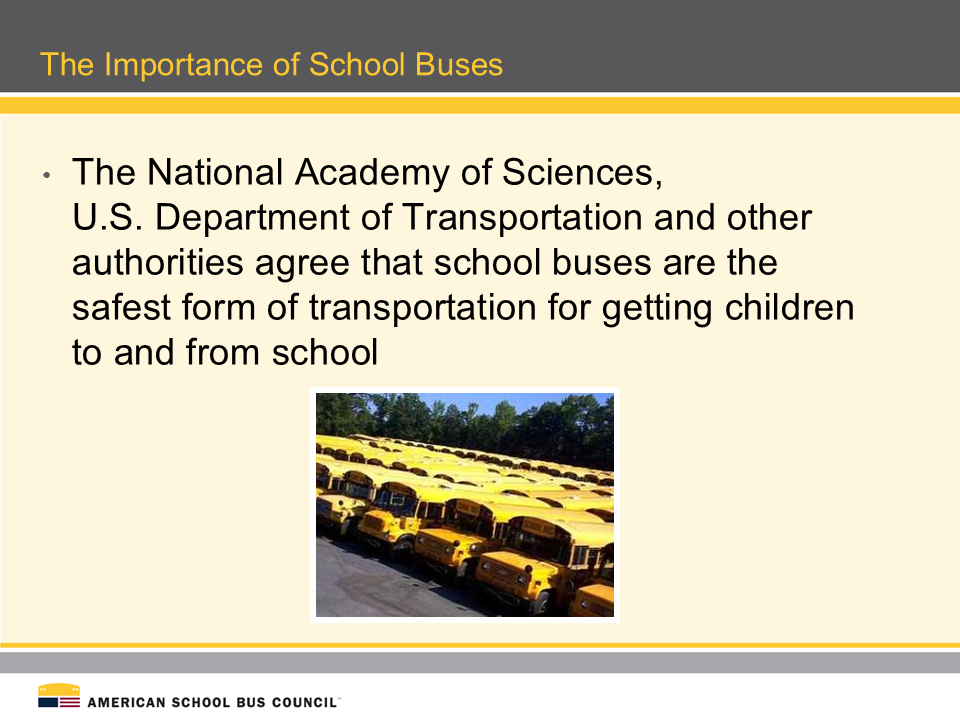 The yellow school bus is an integral component of our educational system. 50% of our nation’s students start and end their school day on the yellow school bus. In particular, students are 44 times more likely to arrive at school alive if they take the bus rather than if they drive or ride with friends